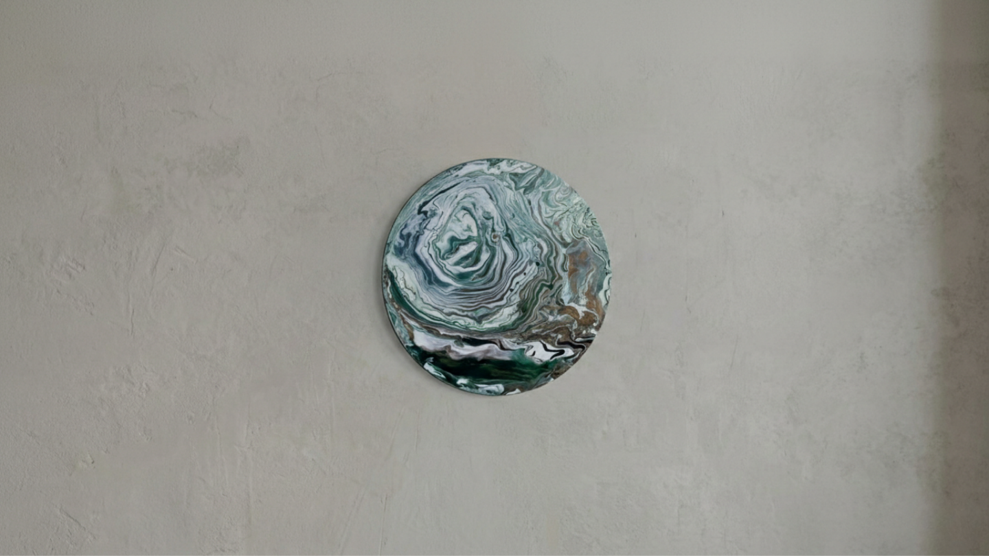 Orijinal akrilik tablolar, bakır el işçiliği ve cam yüzey çalışmaları — mekâna özel vurgu parçaları.