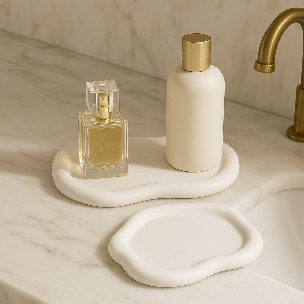 Banyonuzda bakım ürünlerinizi düzenleyebilir, yatak odanızda takılarınızı sergileyebilir veya girişte anahtarlarınız için kullanabilirsiniz. Her bir parça elde dökümle üretilir ve yüzey dokusu kendine özgüdür.