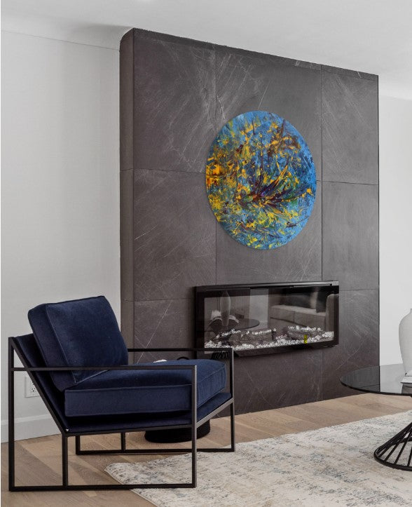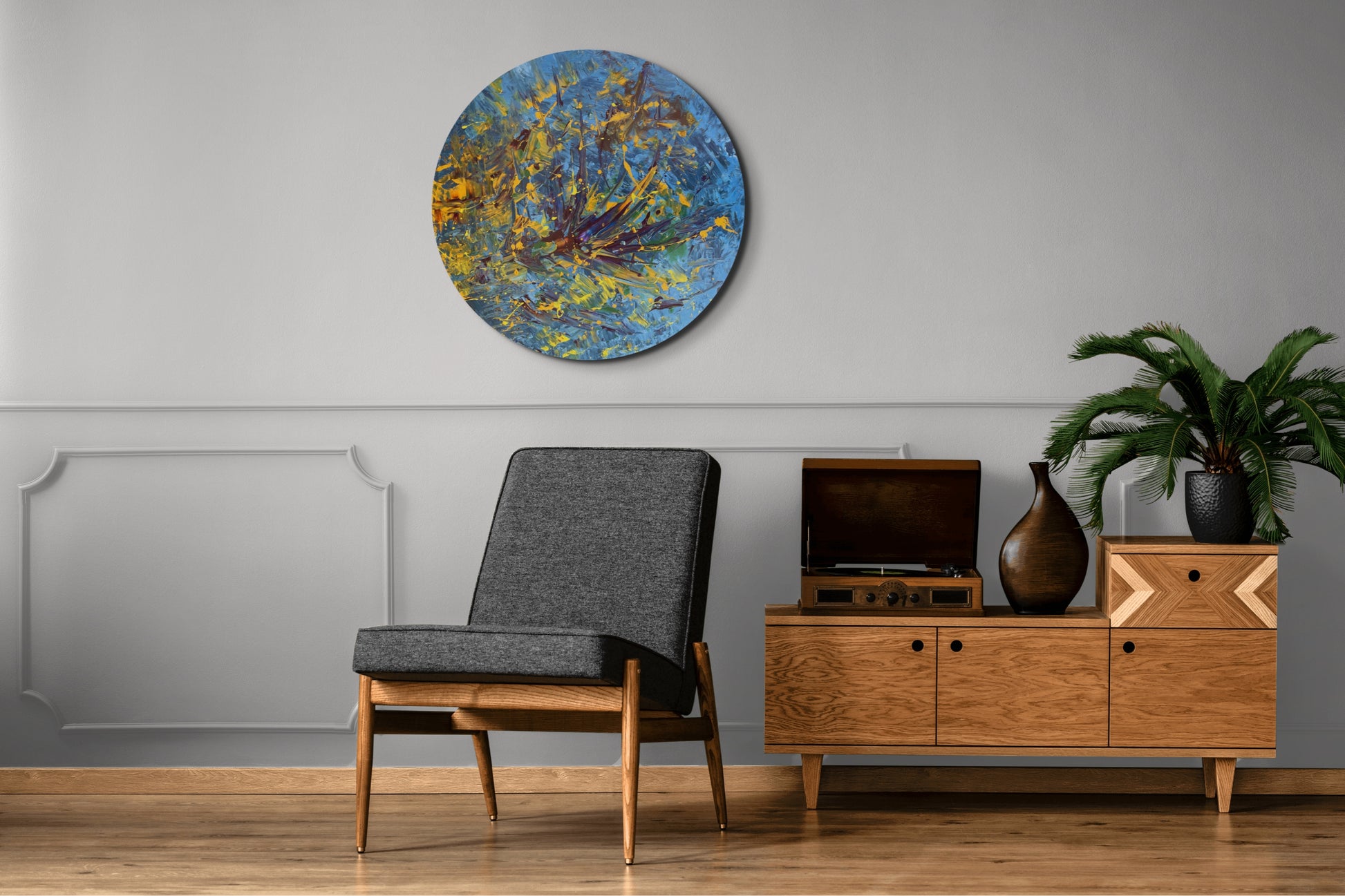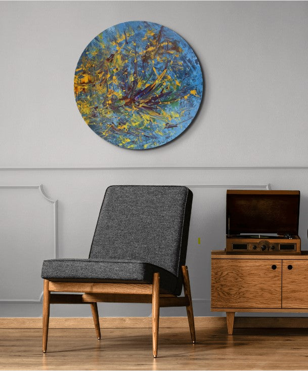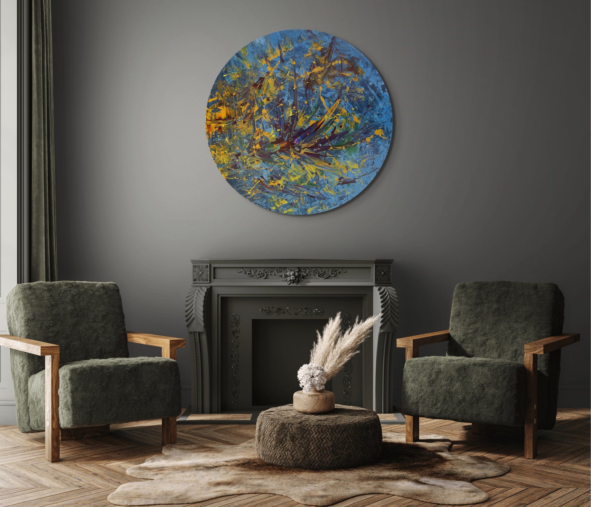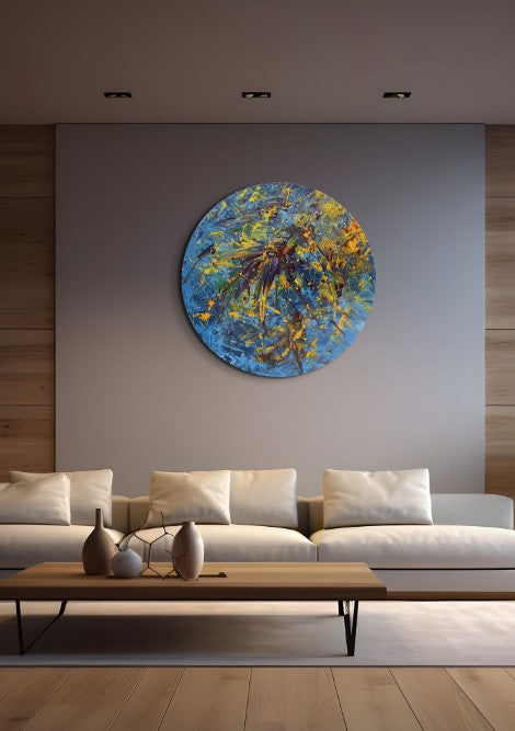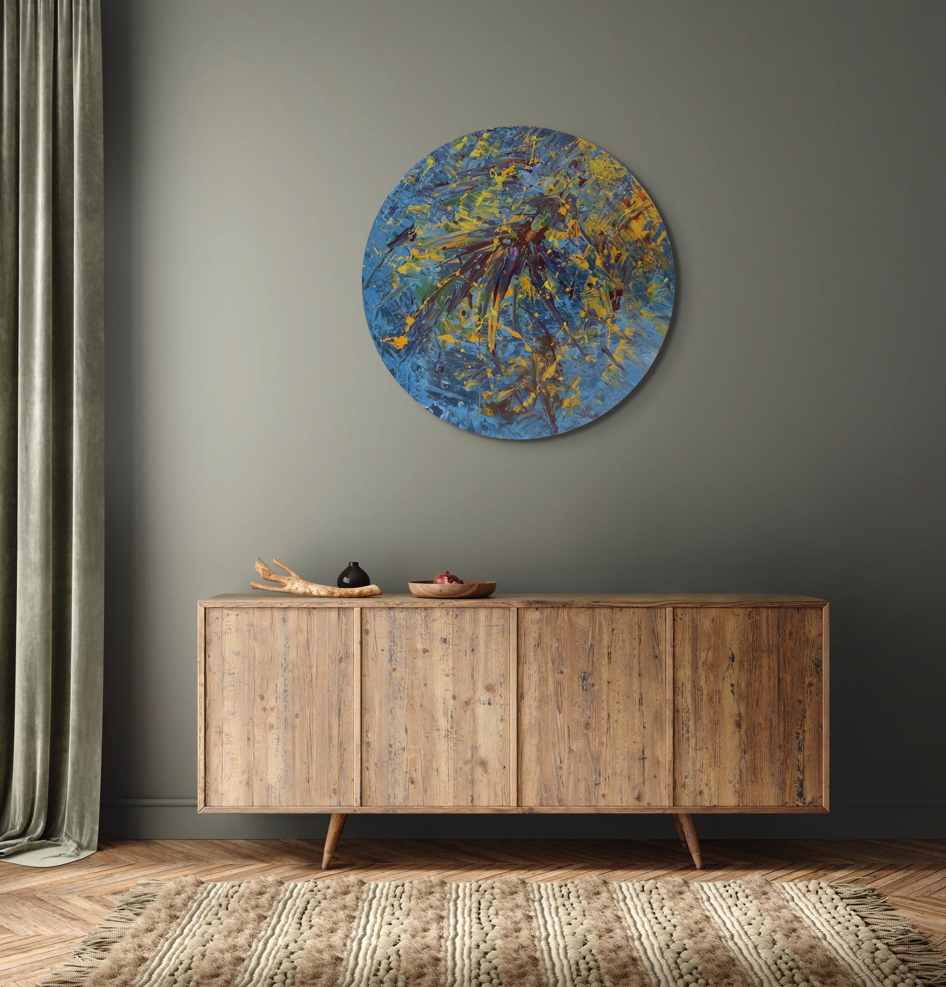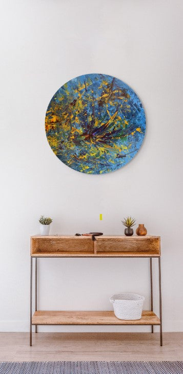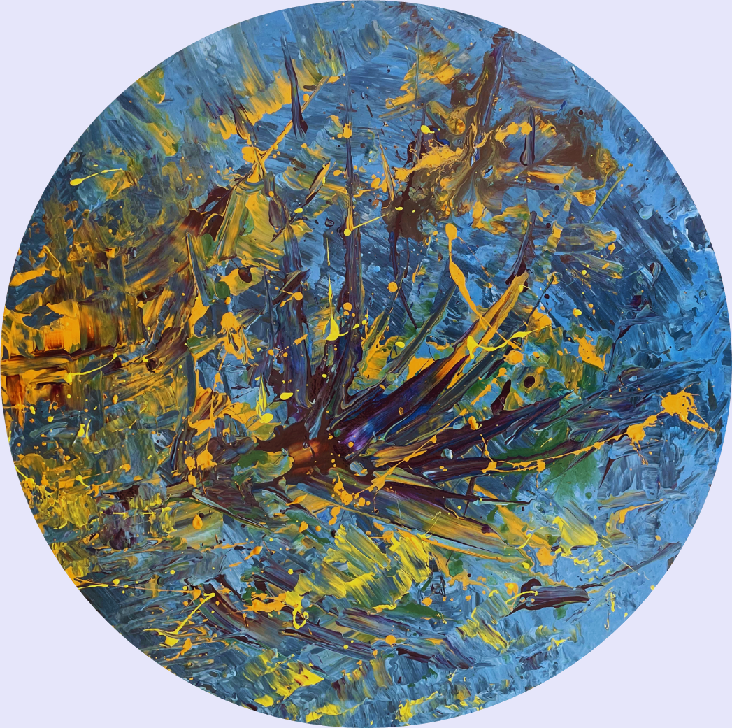 Yuvarlak panel üzerine akrilik boya ile çalışılmış bu eser; spatula ve serbest fırça teknikleriyle hayat bulmuştur.