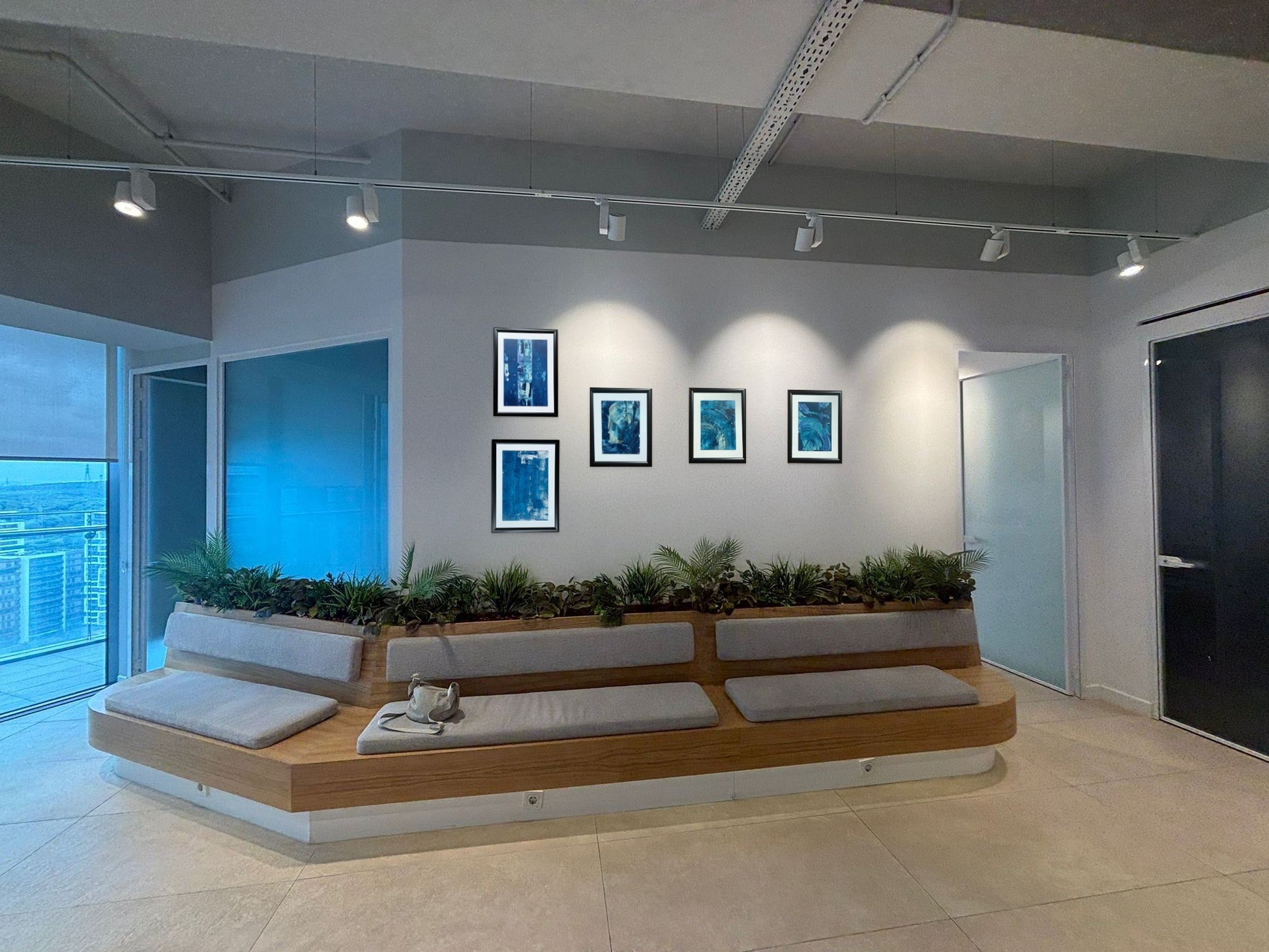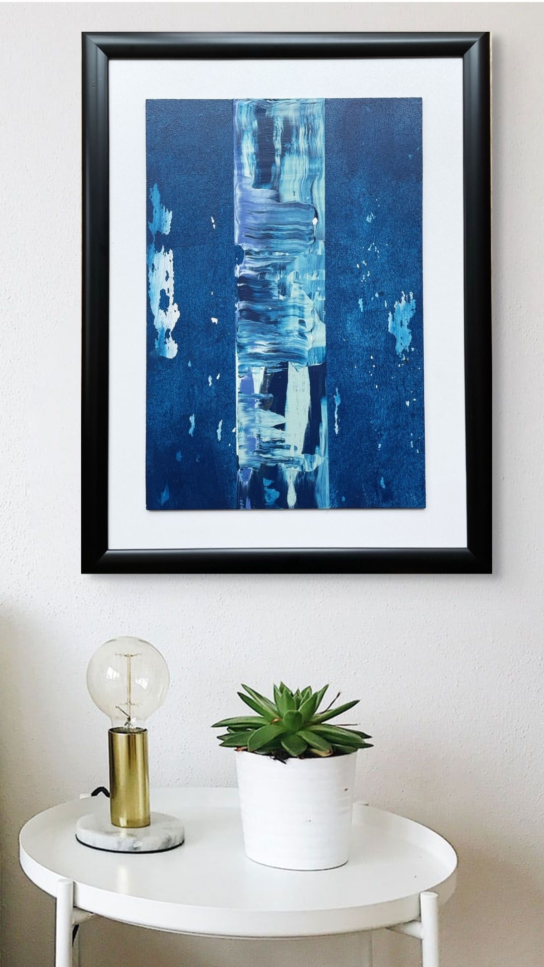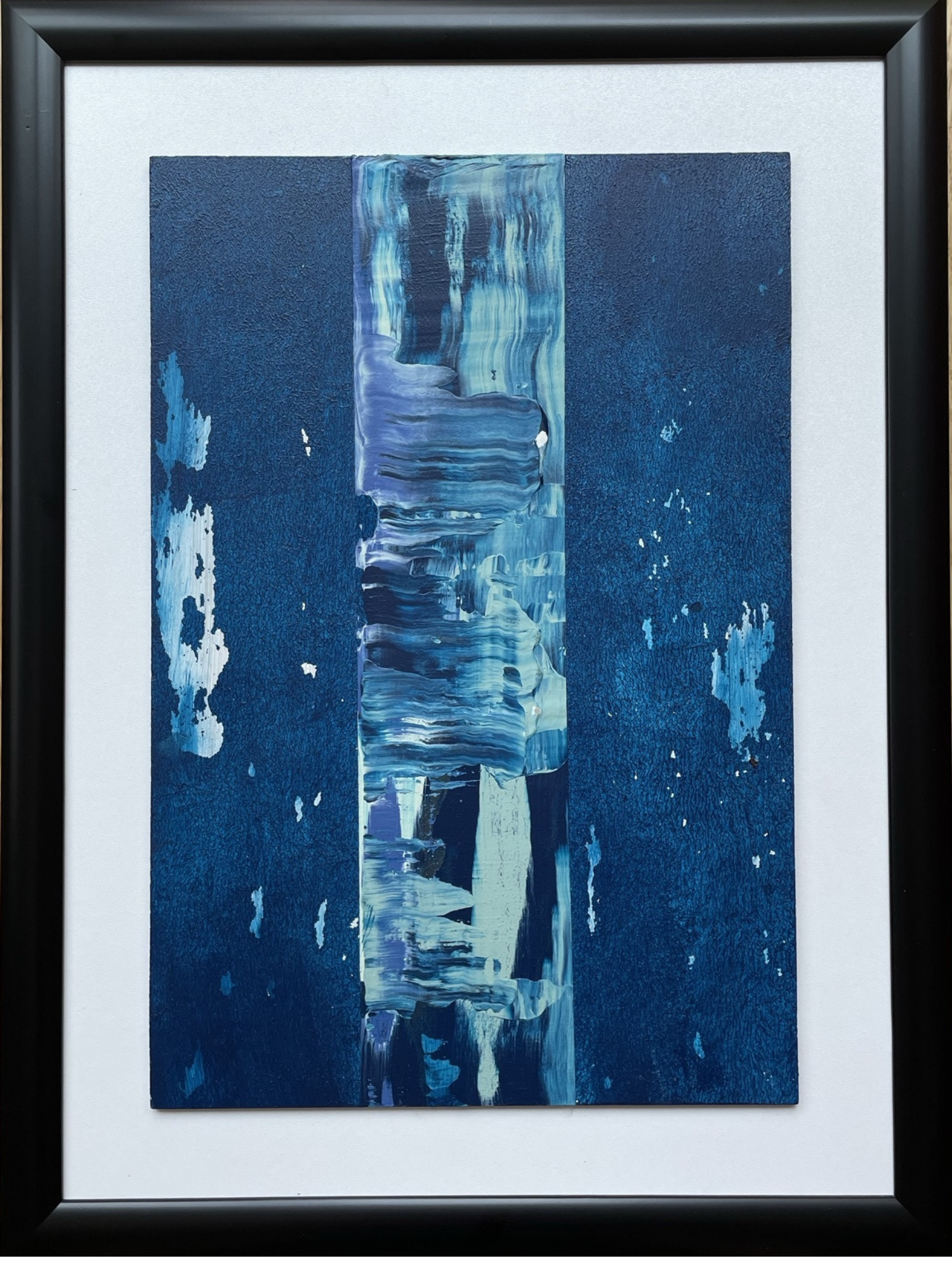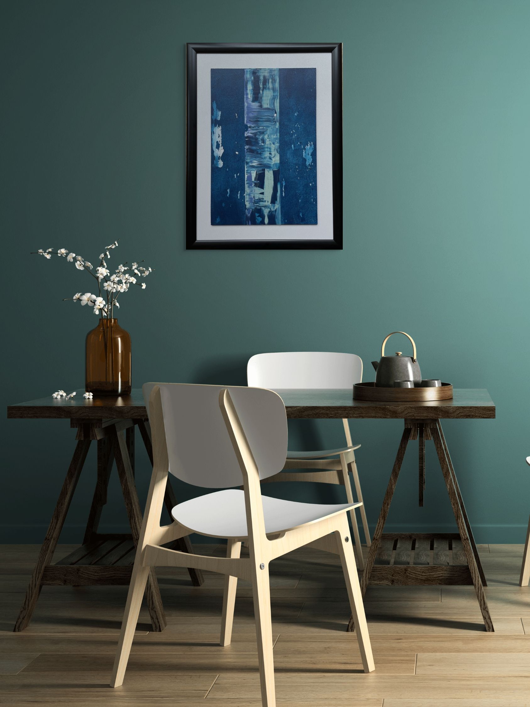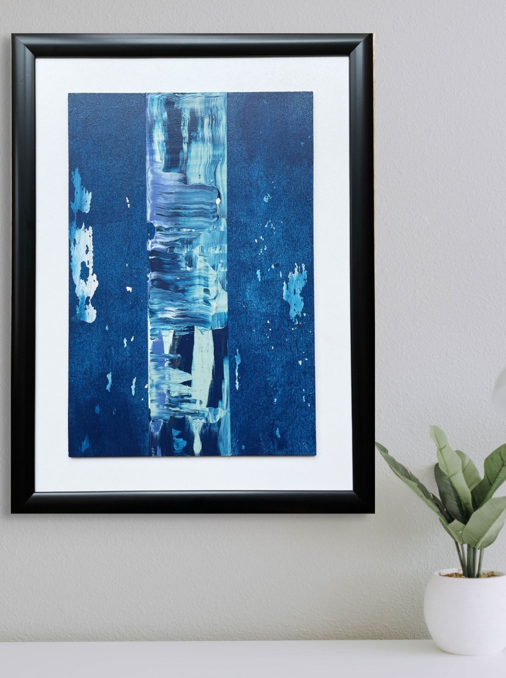 Derin mavi tonların sakin geçişleriyle modern ve ferah bir etki yaratan bu özgün eser, 21 x 31,6 cm ahşap panel üzerine akrilik boya ile elde uygulanmıştır. Minimal siyah çerçeveyle tamamlanan kompozisyon, oturma odası, çalışma alanı ve giriş hollerinde şık bir vurgu oluşturur.