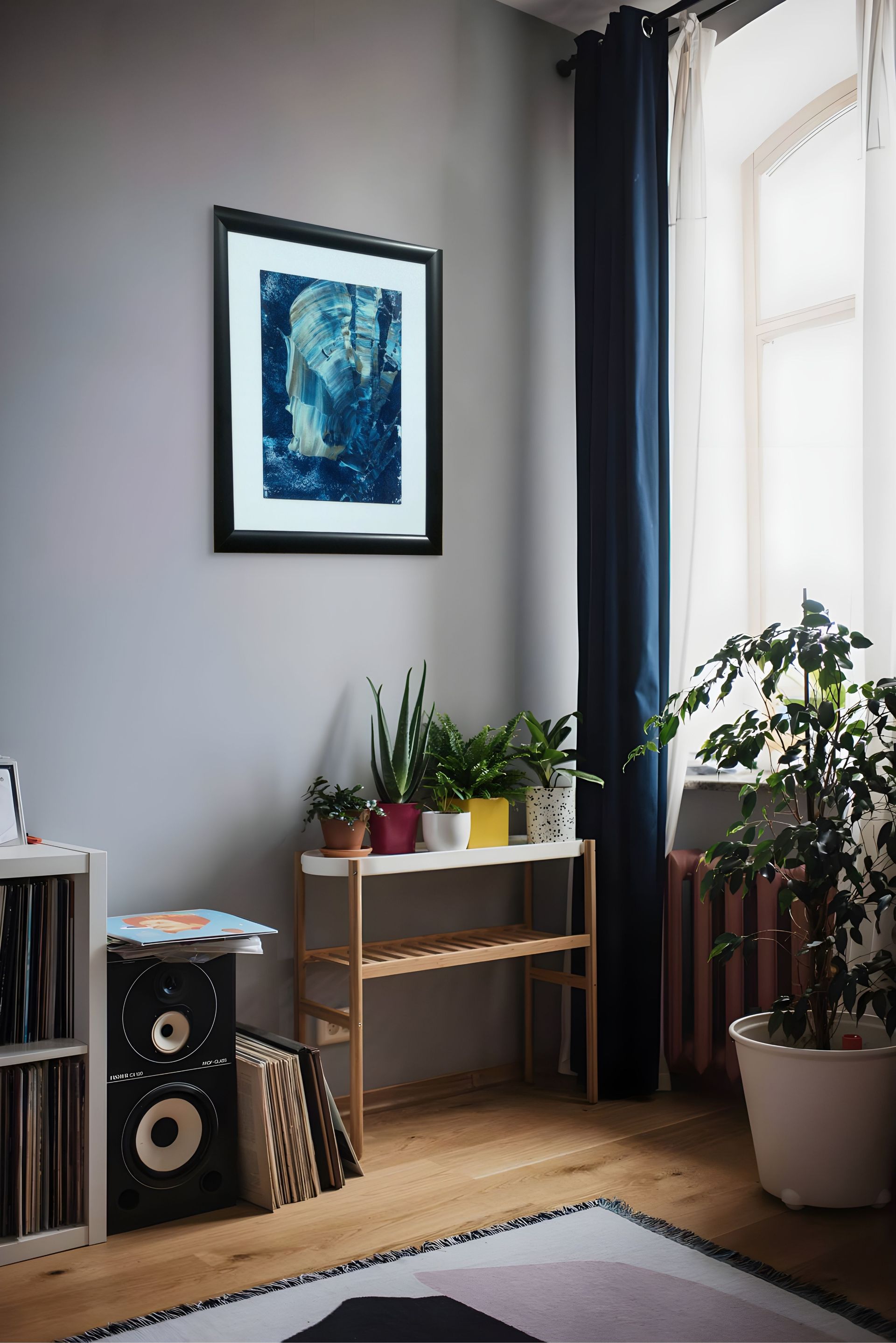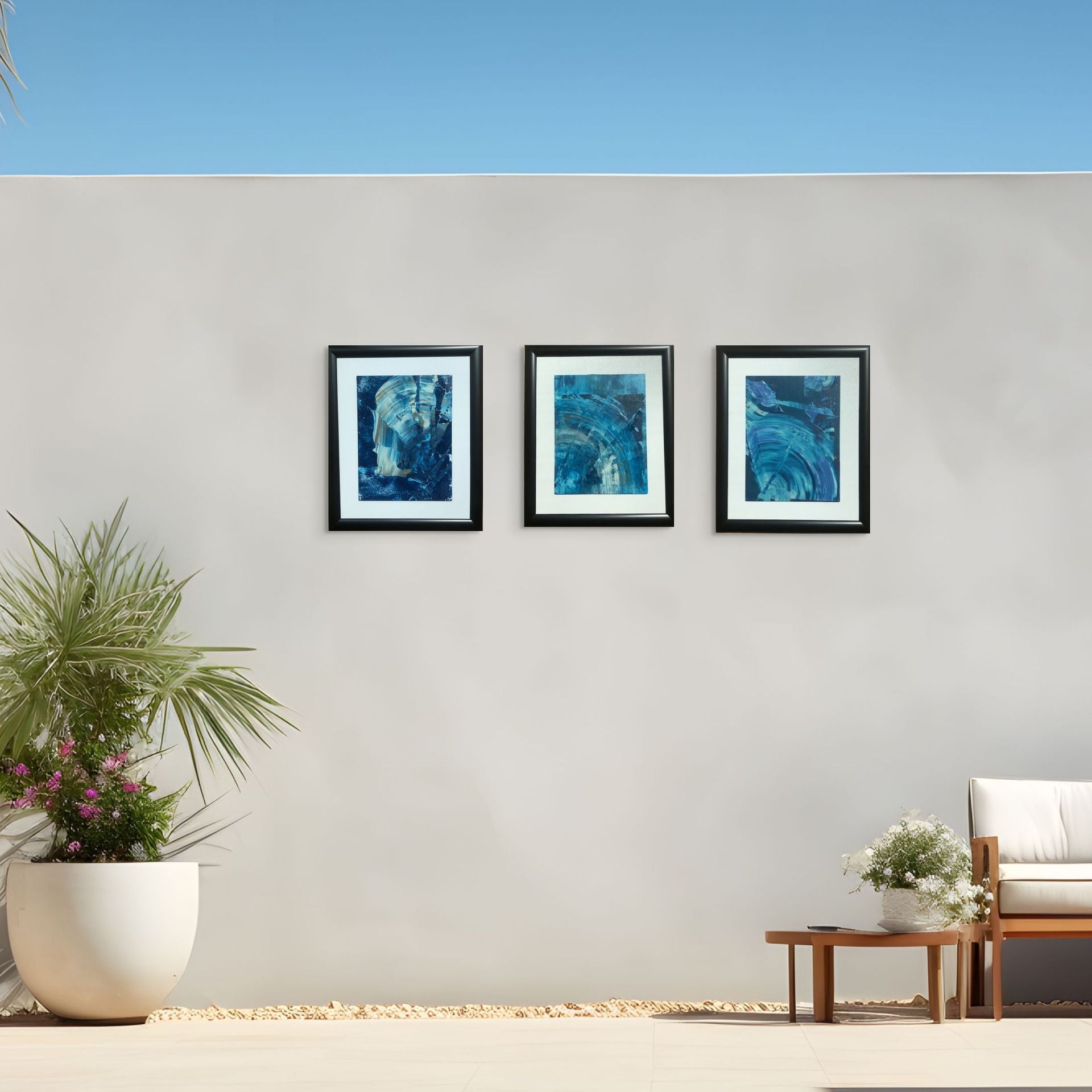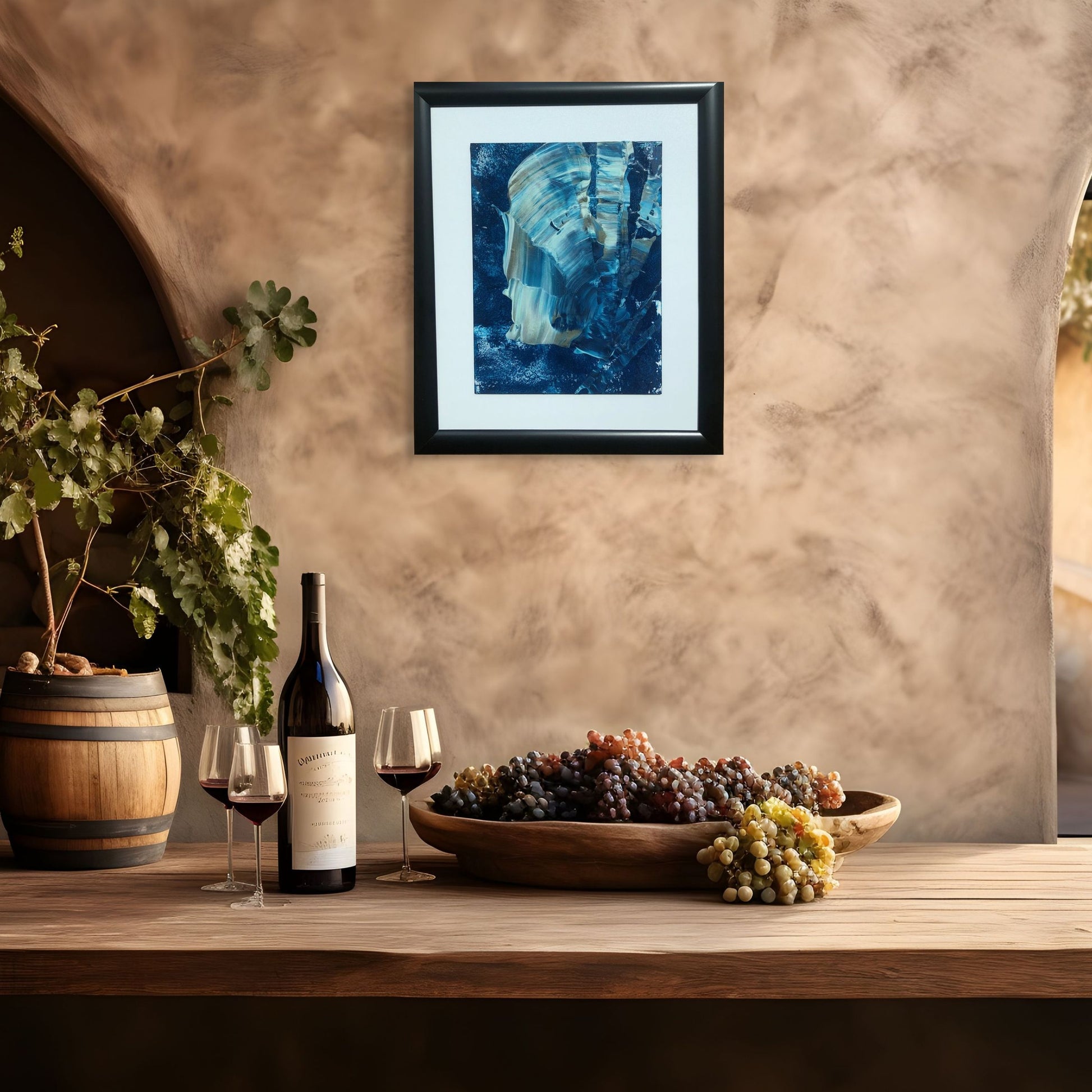 Ege’nin serin rüzgârını ve dalgalarının huzurunu yansıtan bu soyut akrilik çalışma, mavi ve tonlarının katmanlı dokularıyla öne çıkar. Hem enerjik hem de dingin bir atmosfer sunar. Hazır siyah çerçevesiyle modern bir görünüm kazanan eser, yaşam alanlarına zarif bir deniz esintisi katar.