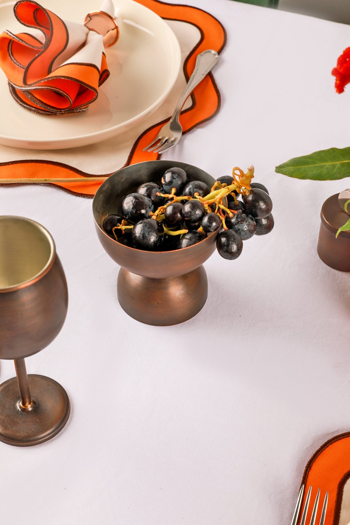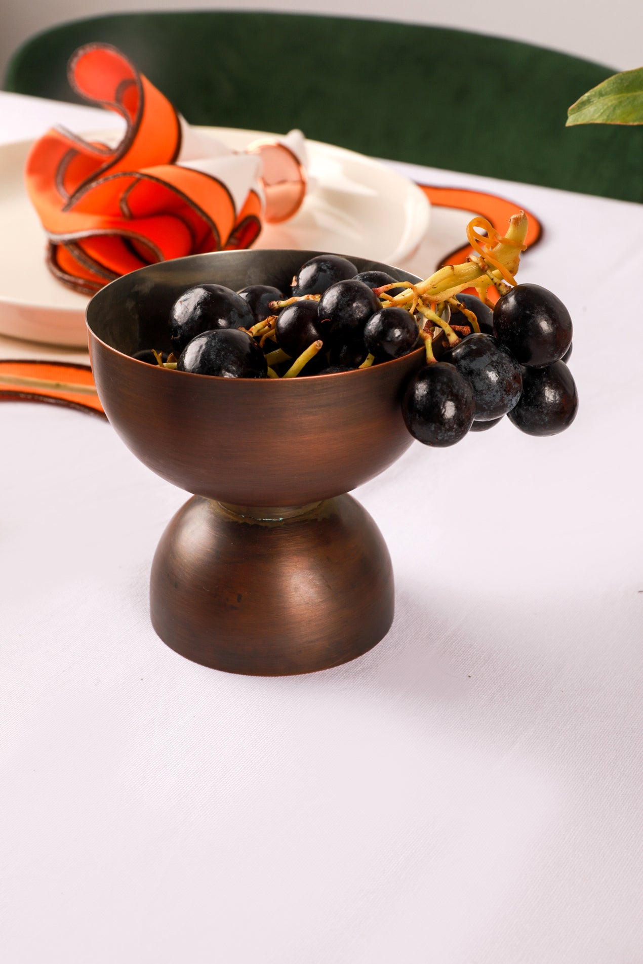 Okside bakırdan üretilen bu çift taraflı kase, el işçiliğinin karakterli dokusunu modern sofralara taşır. Dış yüzeyindeki mat ve koyu tonlu oksit görünümü ile doğal, zamansız bir stil sunar.