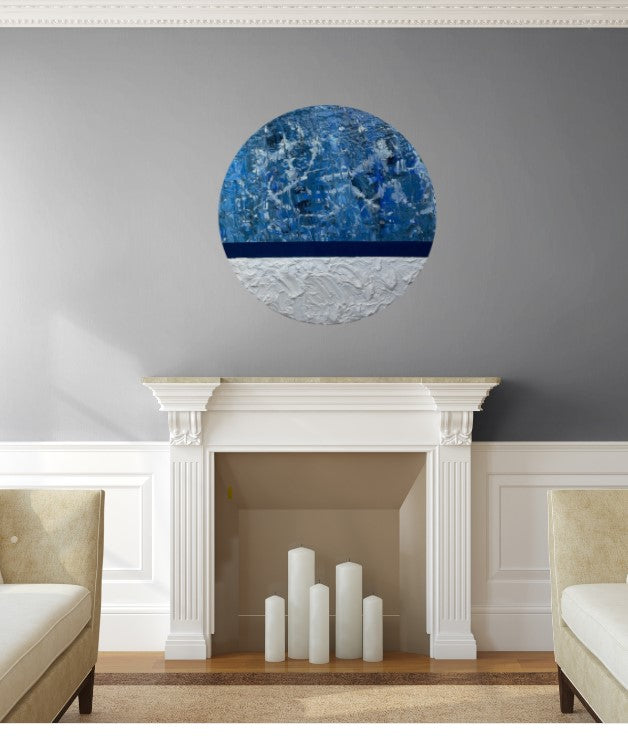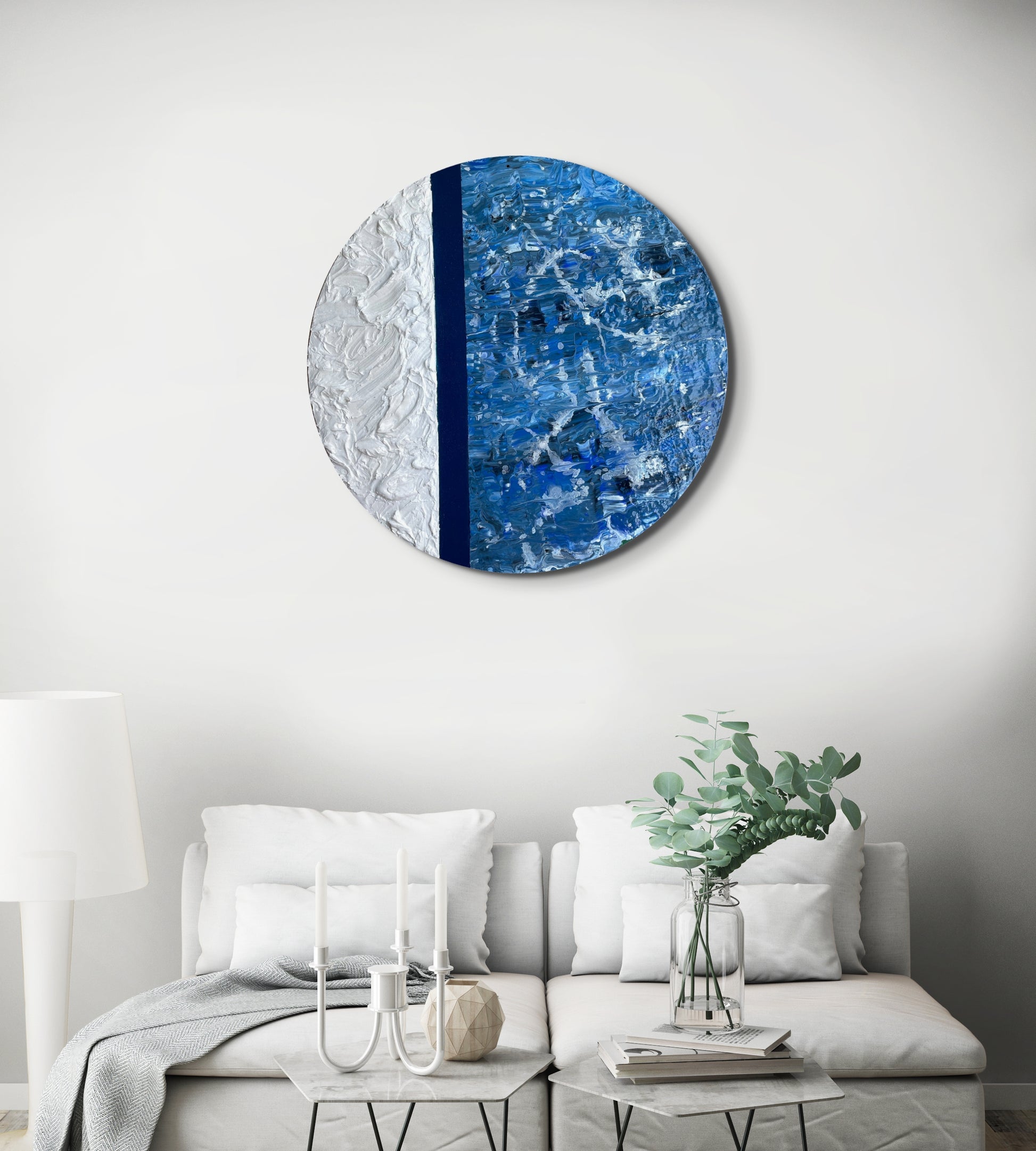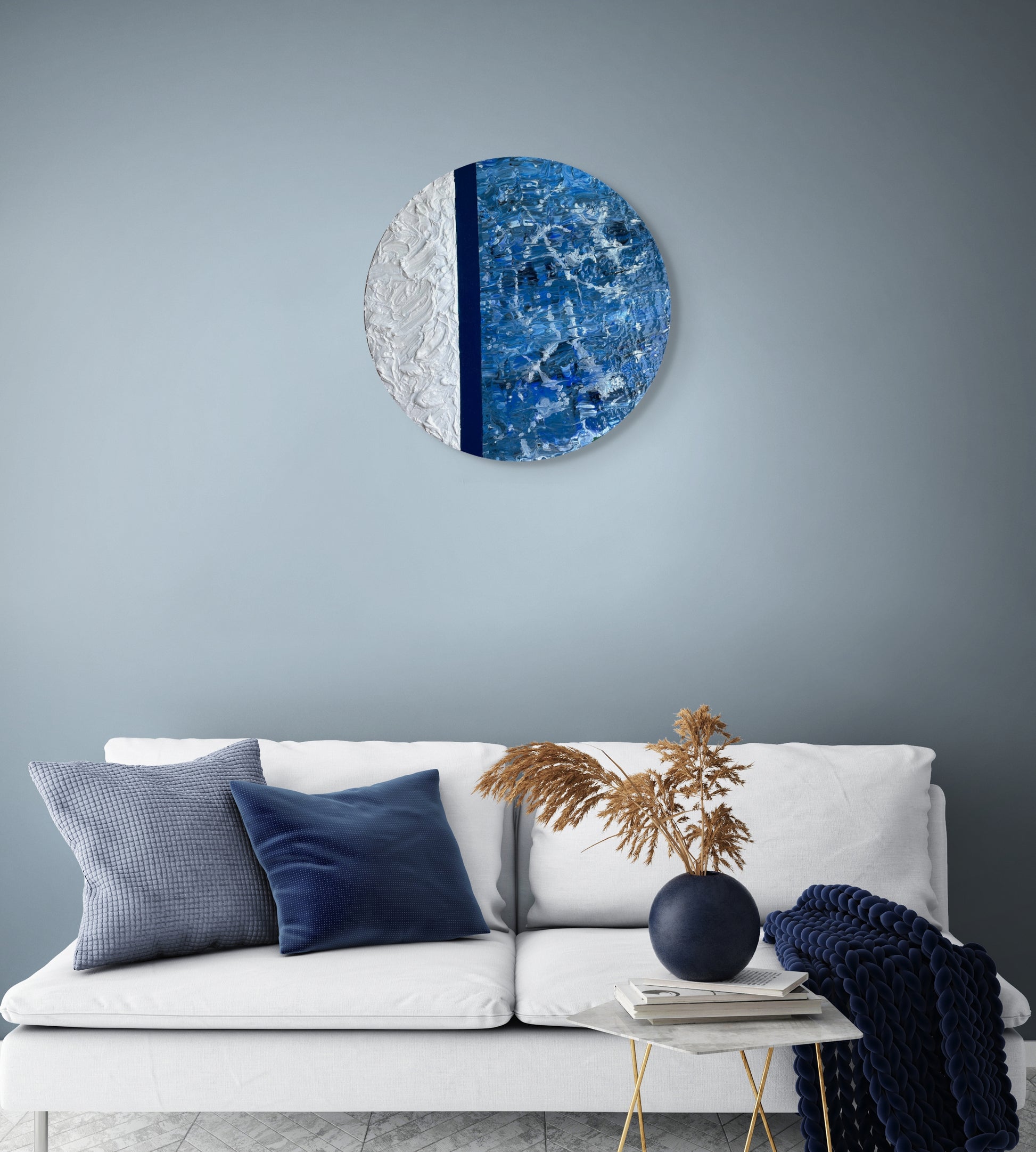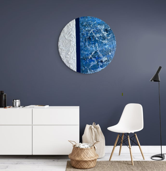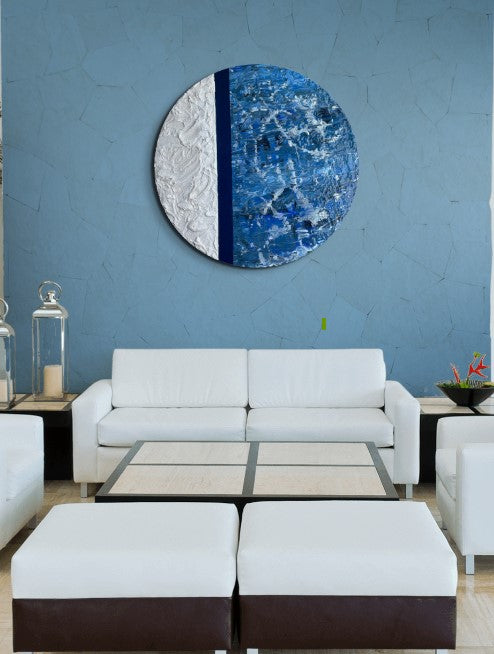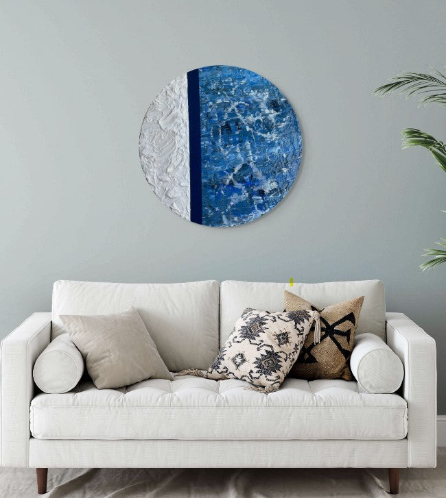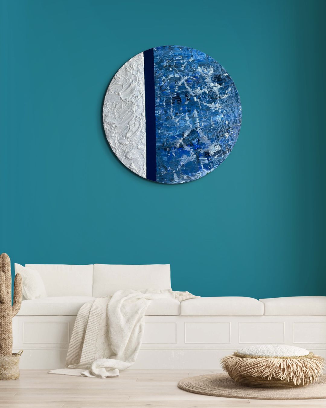 Yuvarlak formdaki bu sanat eseri; beyaz dokulu yüzey ile akışkan mavi tonlarını harmanlayarak, doğanın hem dingin hem de dinamik yönlerini yansıtır.