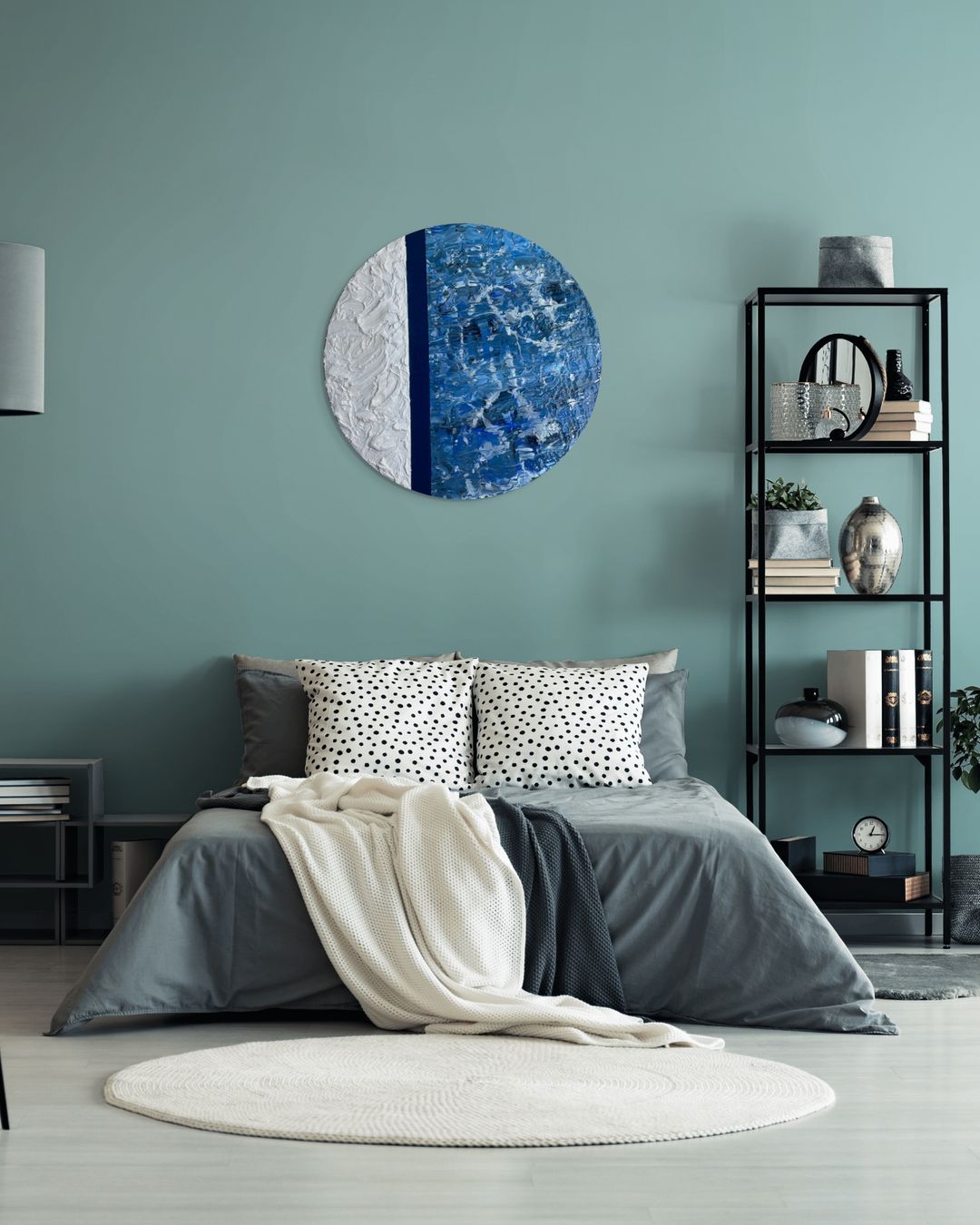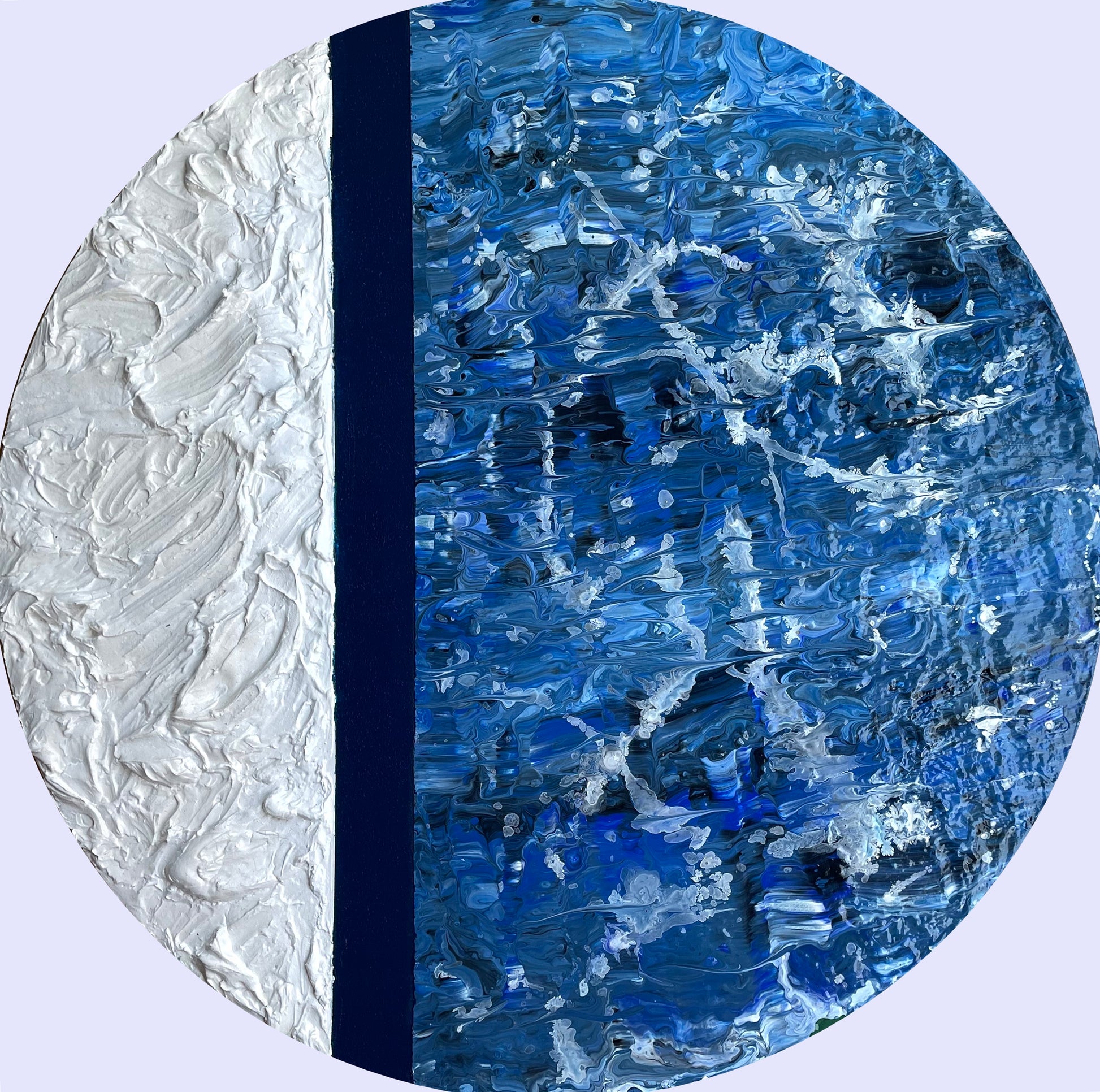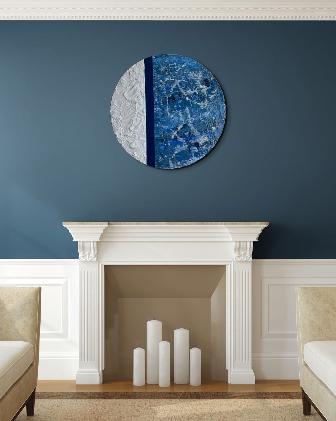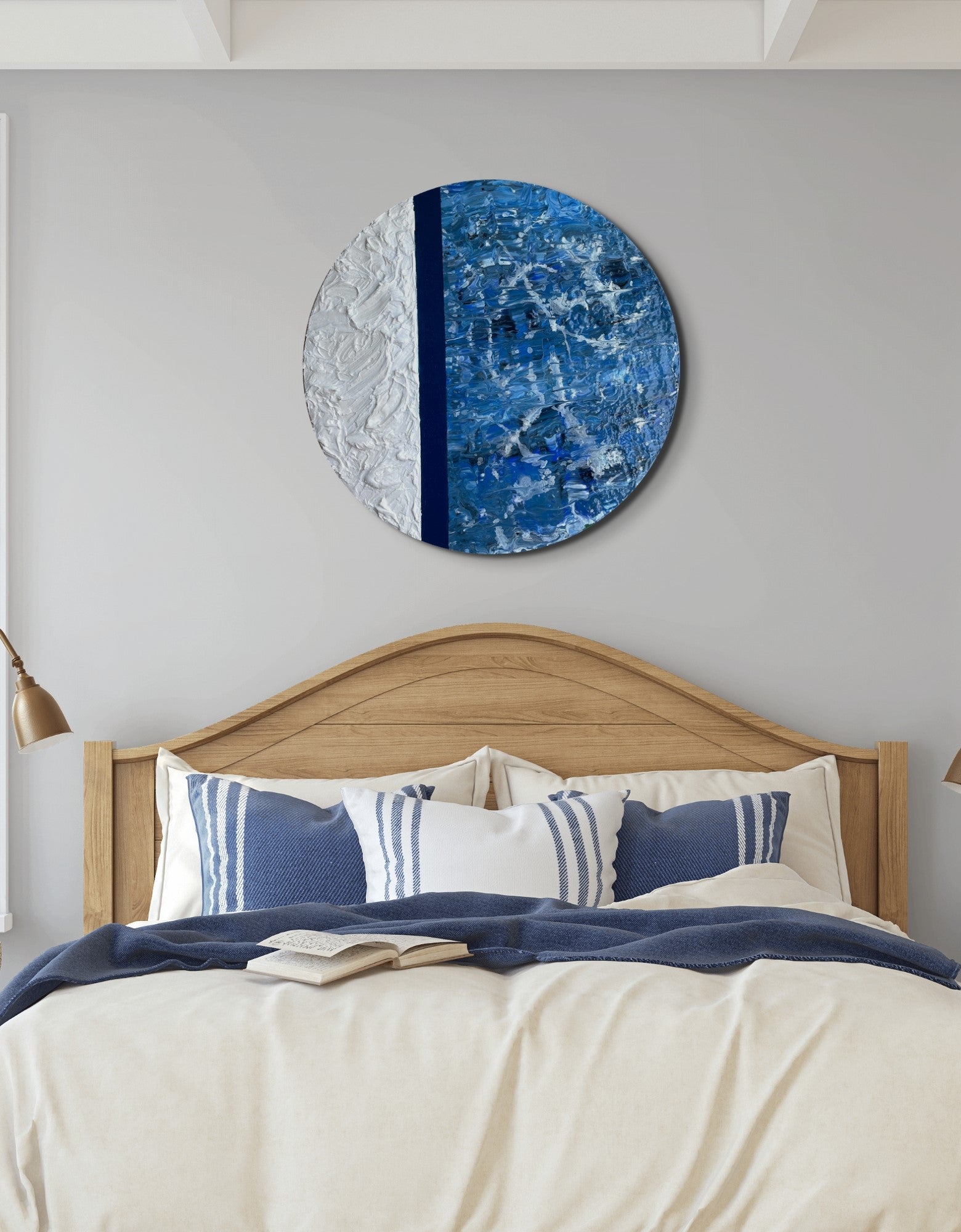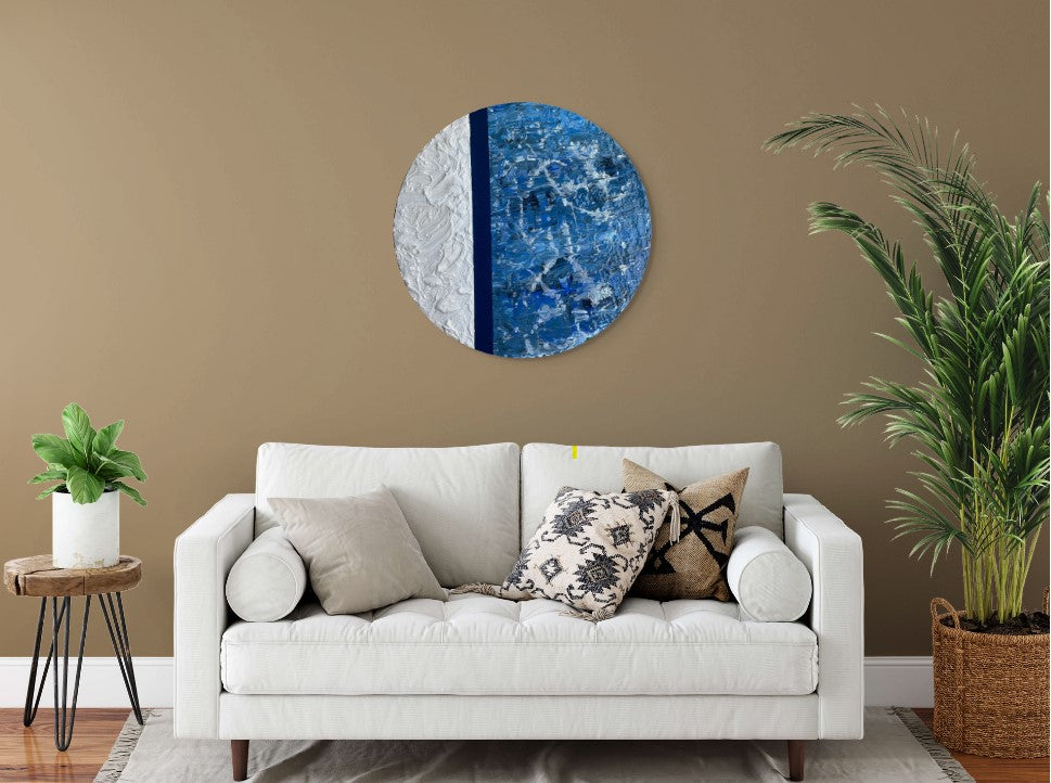 Yuvarlak formdaki bu sanat eseri; beyaz dokulu yüzey ile akışkan mavi tonlarını harmanlayarak, doğanın hem dingin hem de dinamik yönlerini yansıtır.