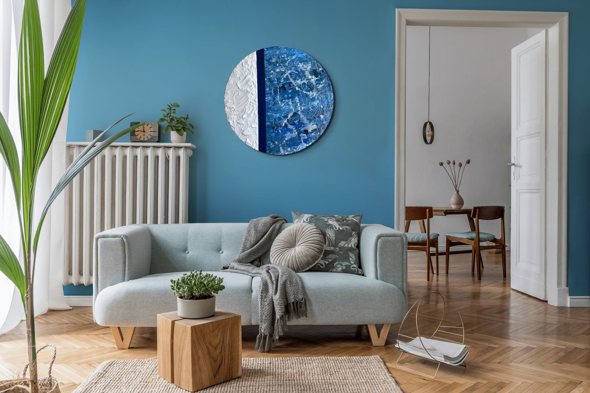 Okyanus Nefesi - Yuvarlak El Yapımı Soyut Tablo 50 cm - Mavi Tonlarda Mixed Media Duvar Sanatı