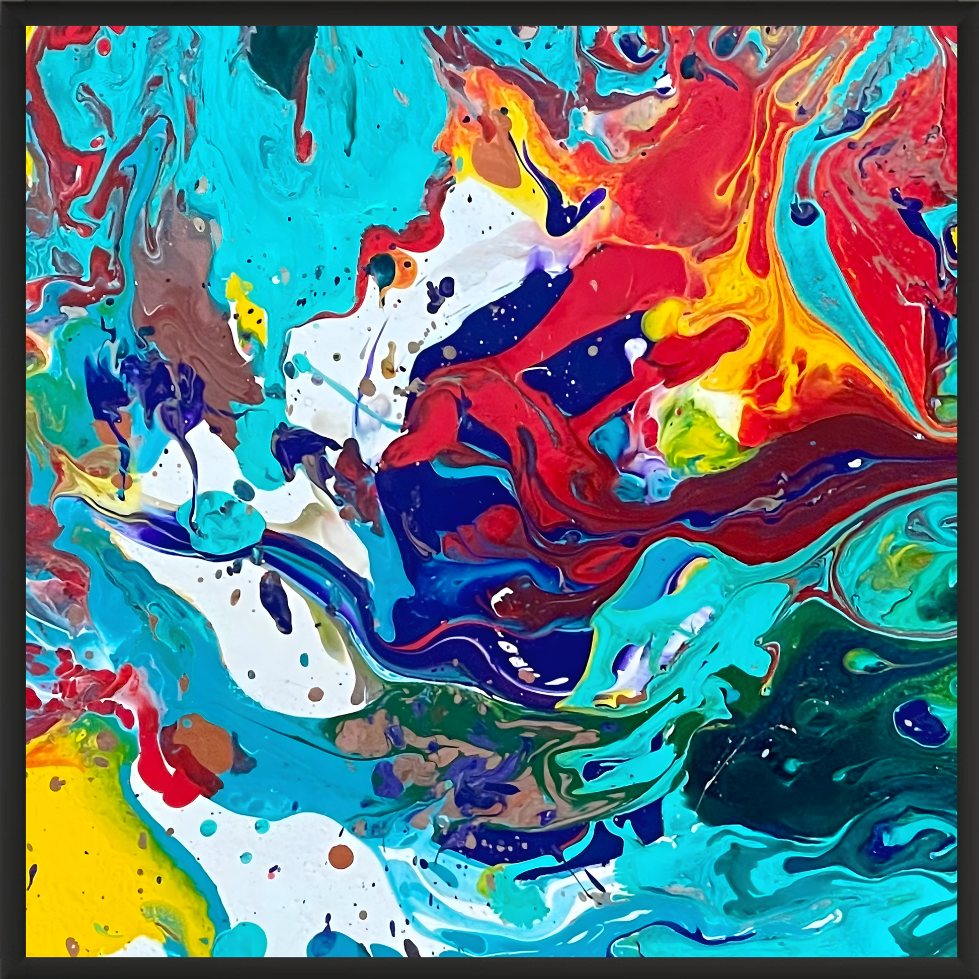 Turkuazın ferahlığı, kırmızının tutkusu, sarının enerjisi ve siyahın derinliği… Coşku, bu güçlü renkleri hareketli fırça darbeleriyle bir araya getirerek benzersiz bir görsel şölen sunuyor. Her bakışta farklı bir hikâye barındıran bu soyut tasarım, modern yaşam alanlarına estetik bir dokunuş kazandırıyor.
