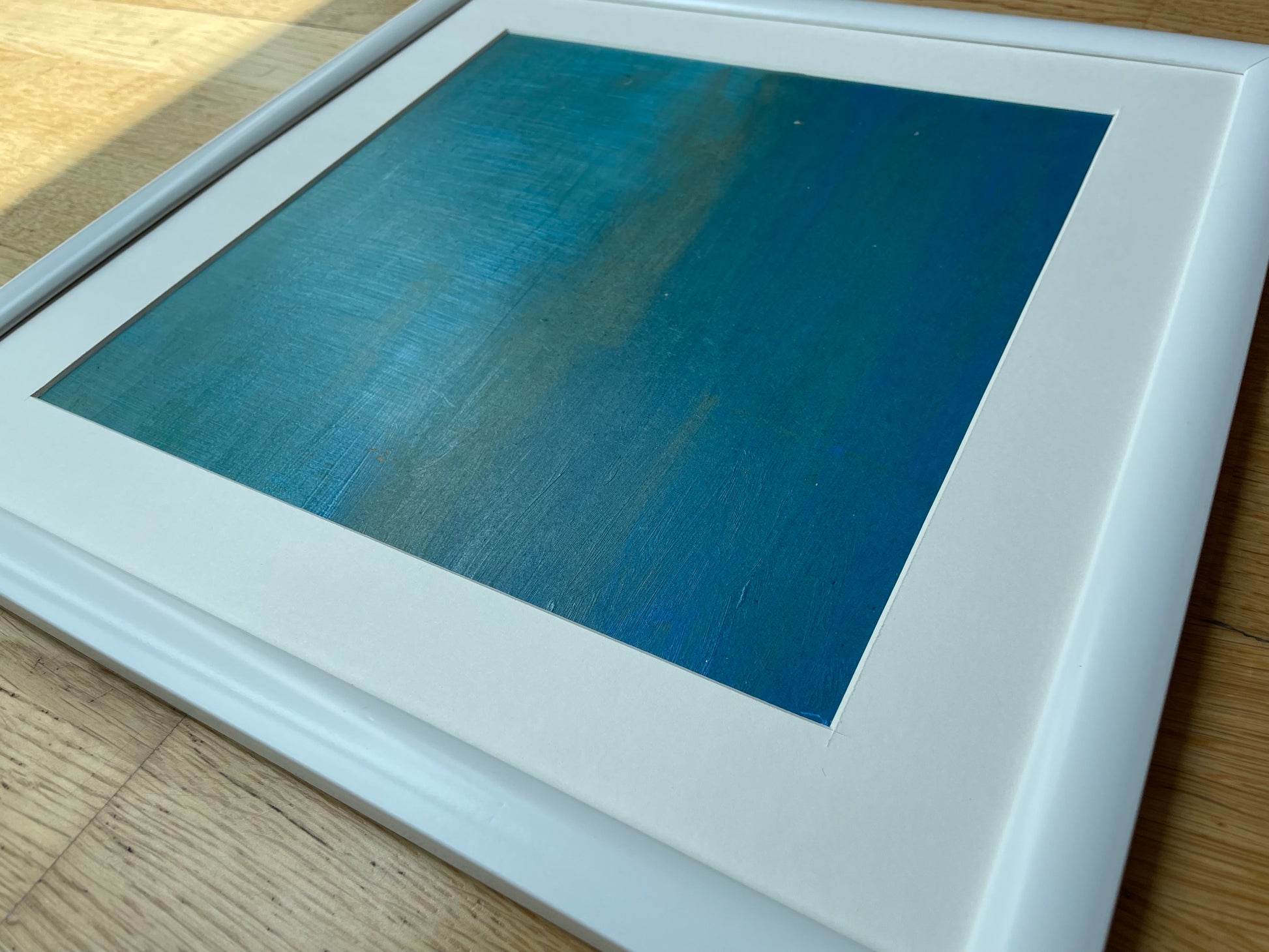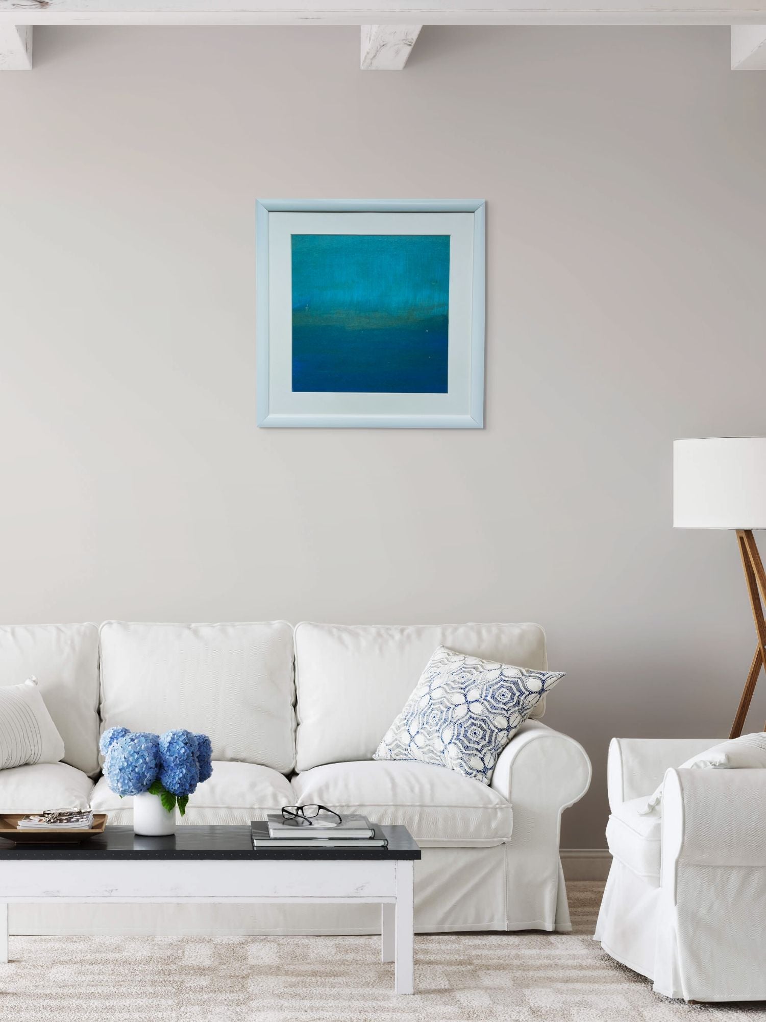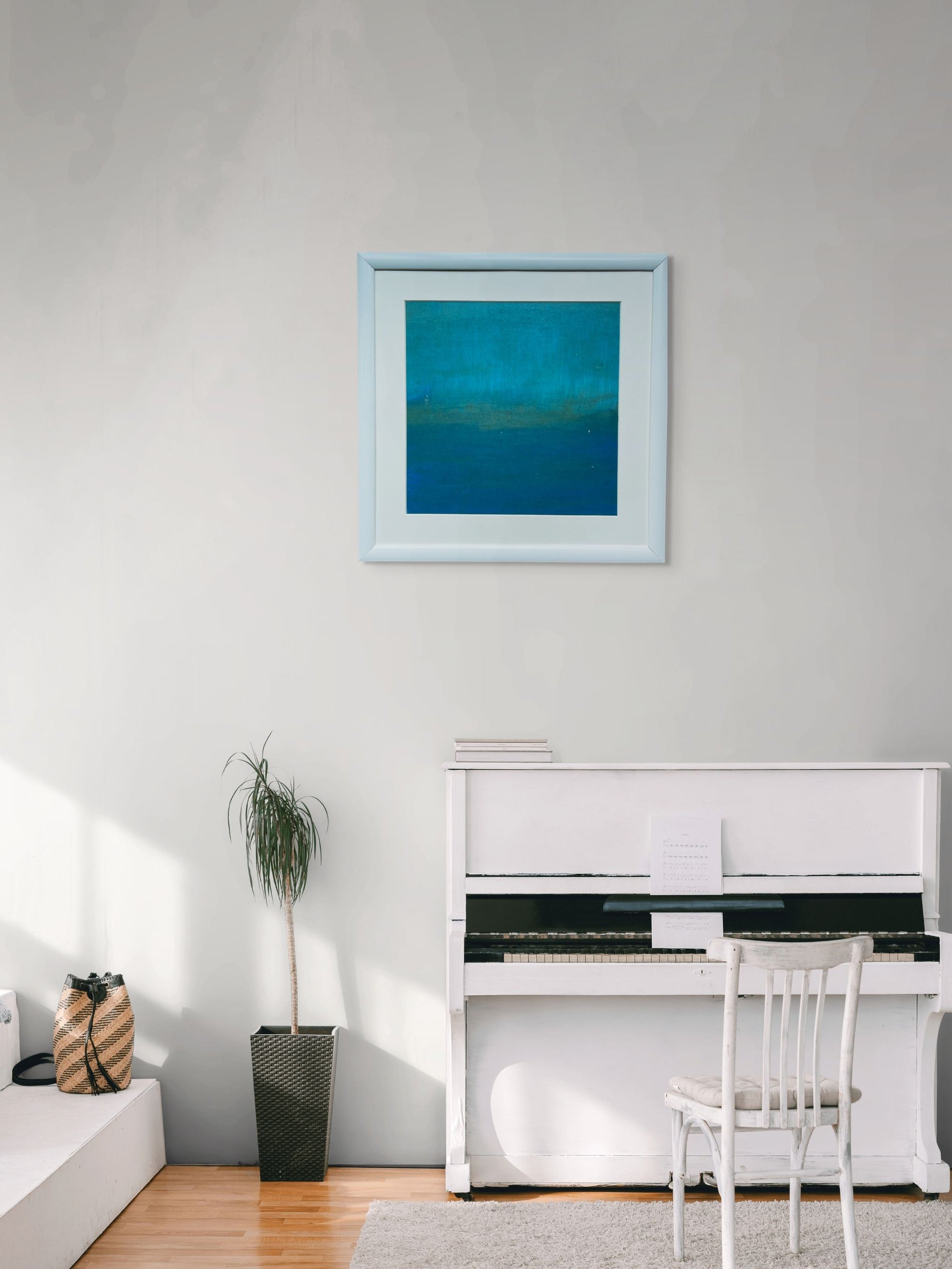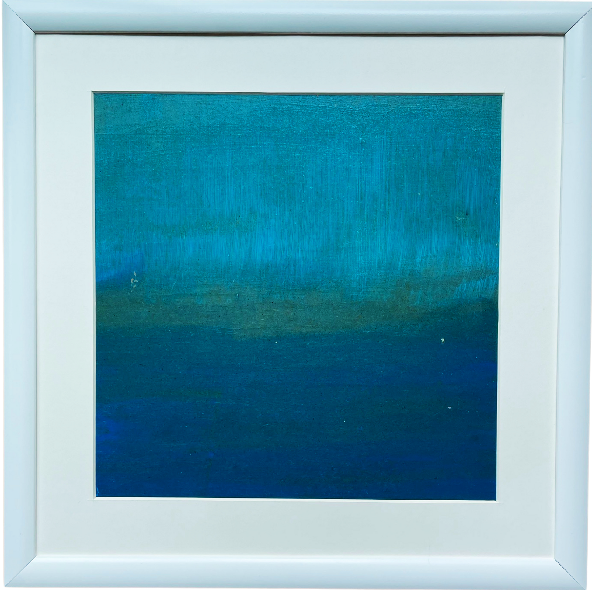 Derin mavi ve turkuaz geçişleriyle Ege’nin sakinliğini taşıyan bu özgün eser, orijinal akrilik pouring tekniğiyle 26 cm kare ahşap panel üzerine elde uygulanmıştır. Minimal beyaz çerçeveyle tamamlanan kompozisyon, modern yaşam alanlarına ferah ve sofistike bir vurgu katar.