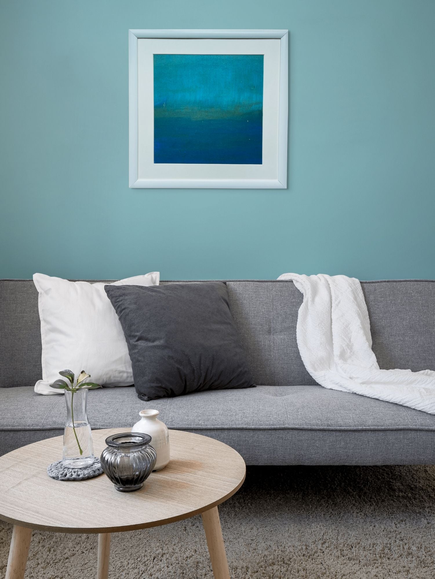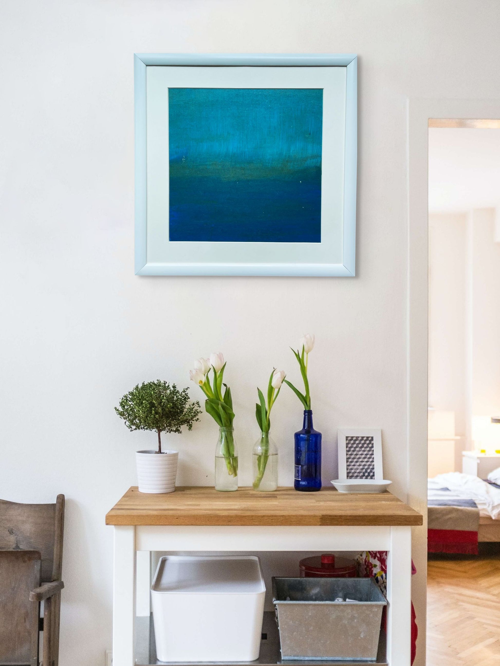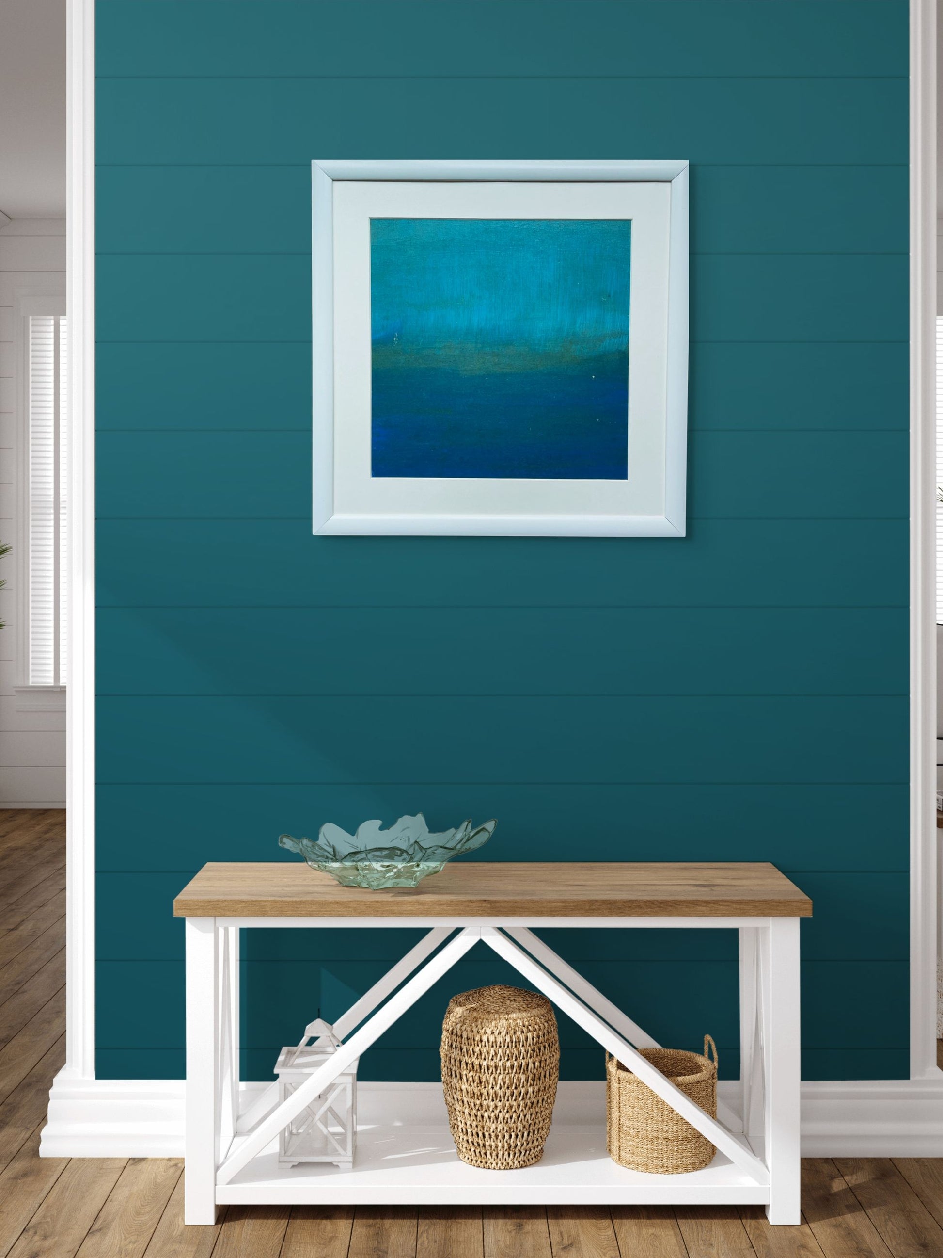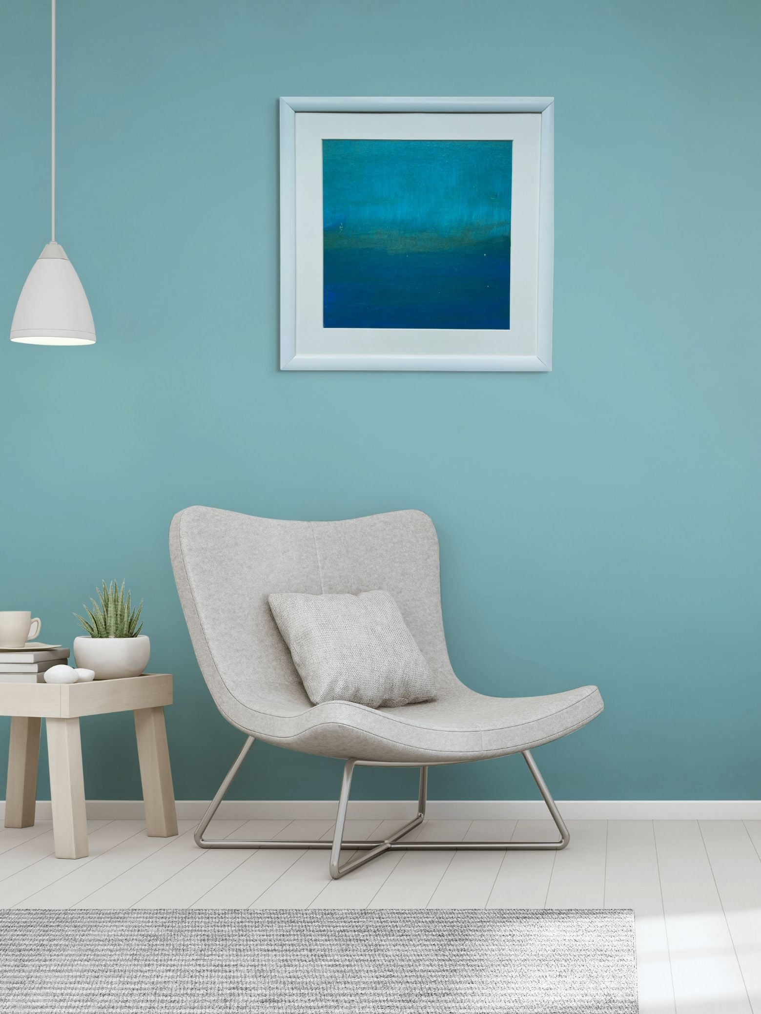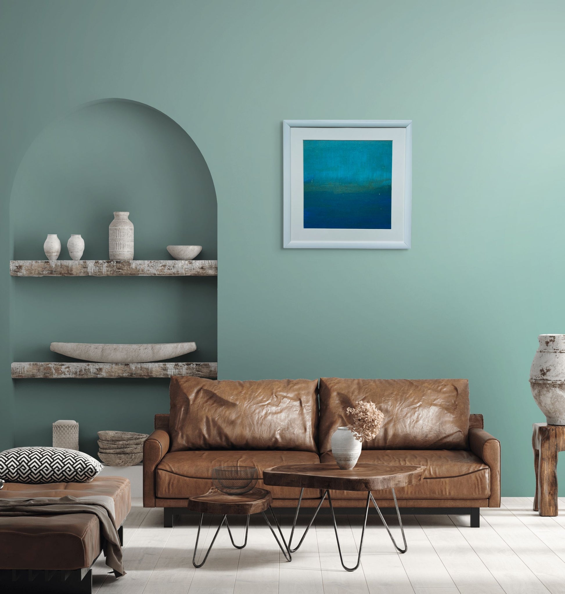 Derin mavi ve turkuaz geçişleriyle Ege’nin sakinliğini taşıyan bu özgün eser, orijinal akrilik pouring tekniğiyle 26 cm kare ahşap panel üzerine elde uygulanmıştır. Minimal beyaz çerçeveyle tamamlanan kompozisyon, modern yaşam alanlarına ferah ve sofistike bir vurgu katar.