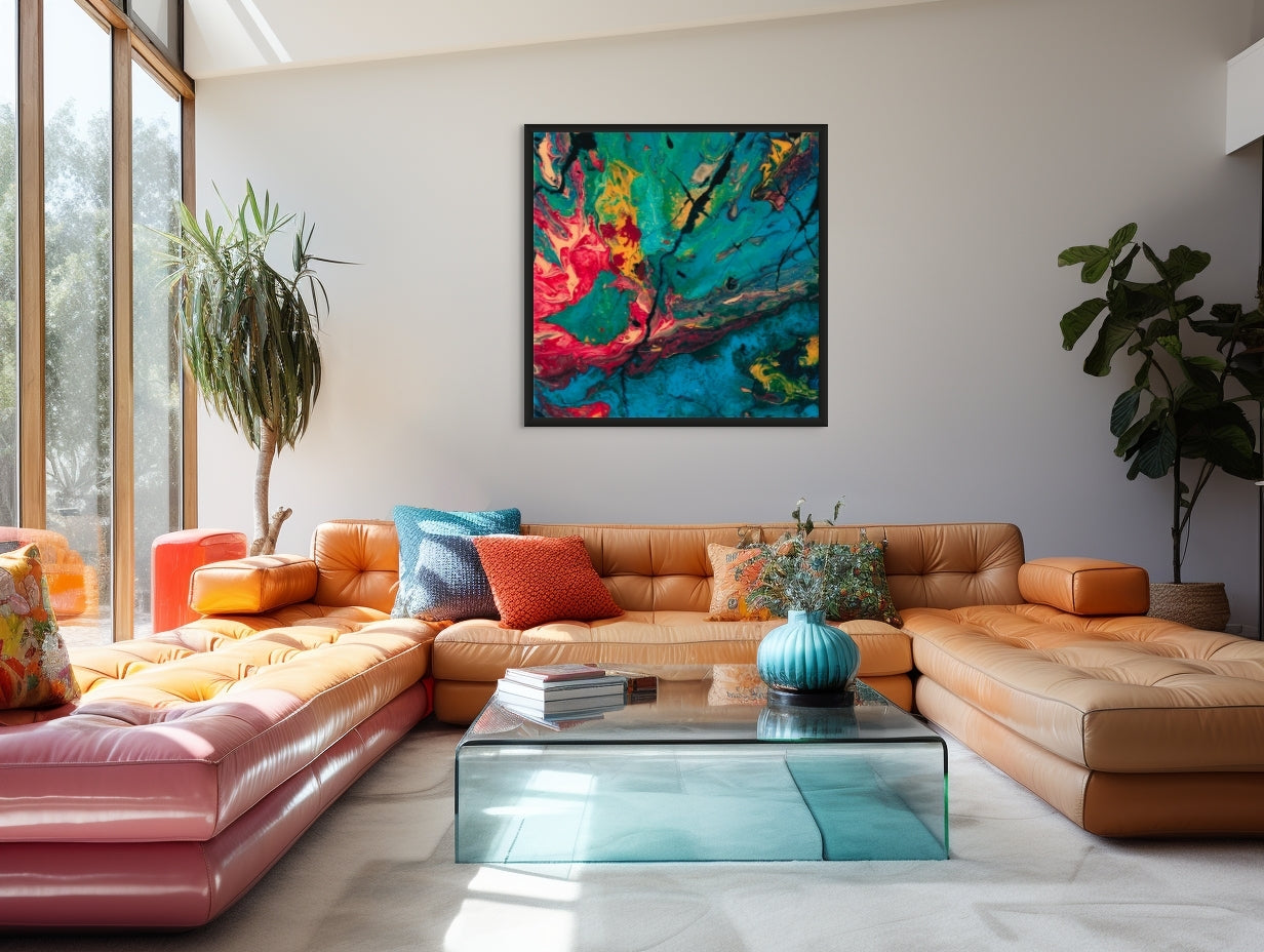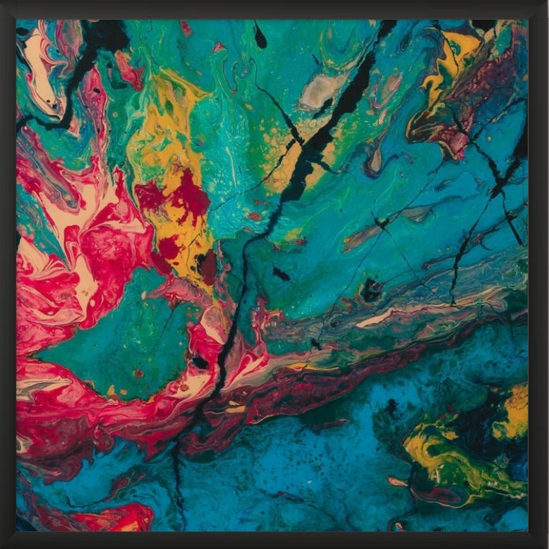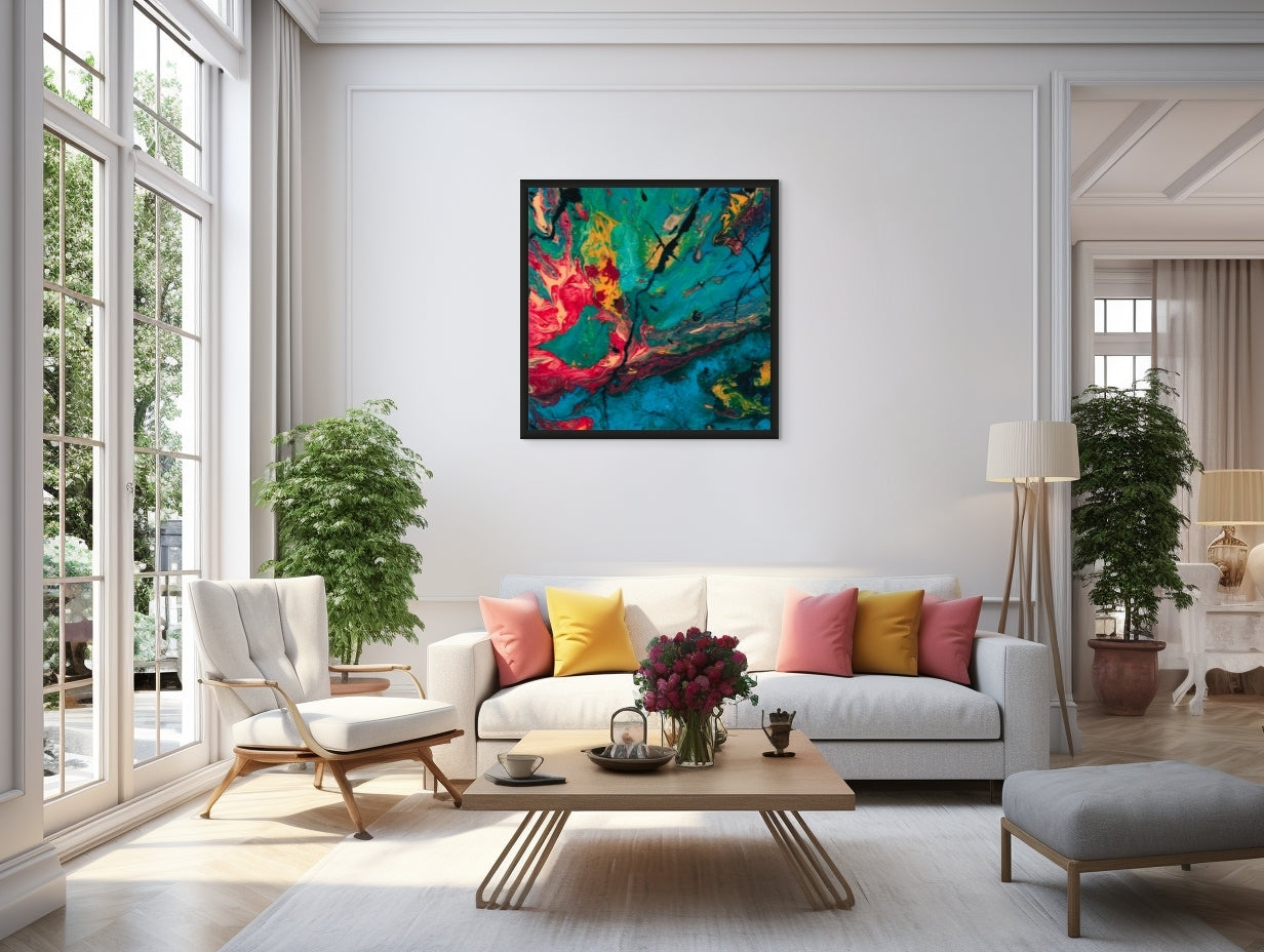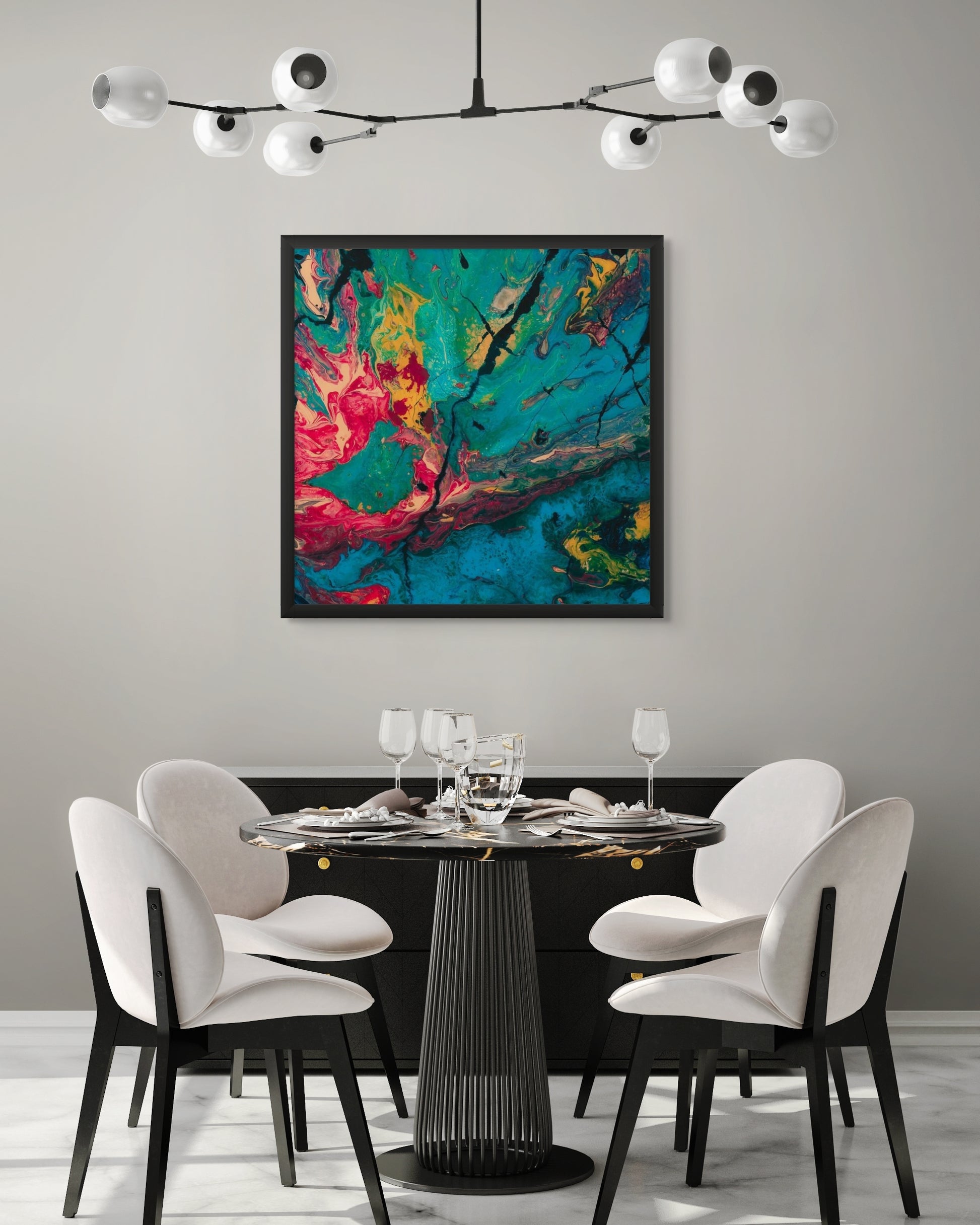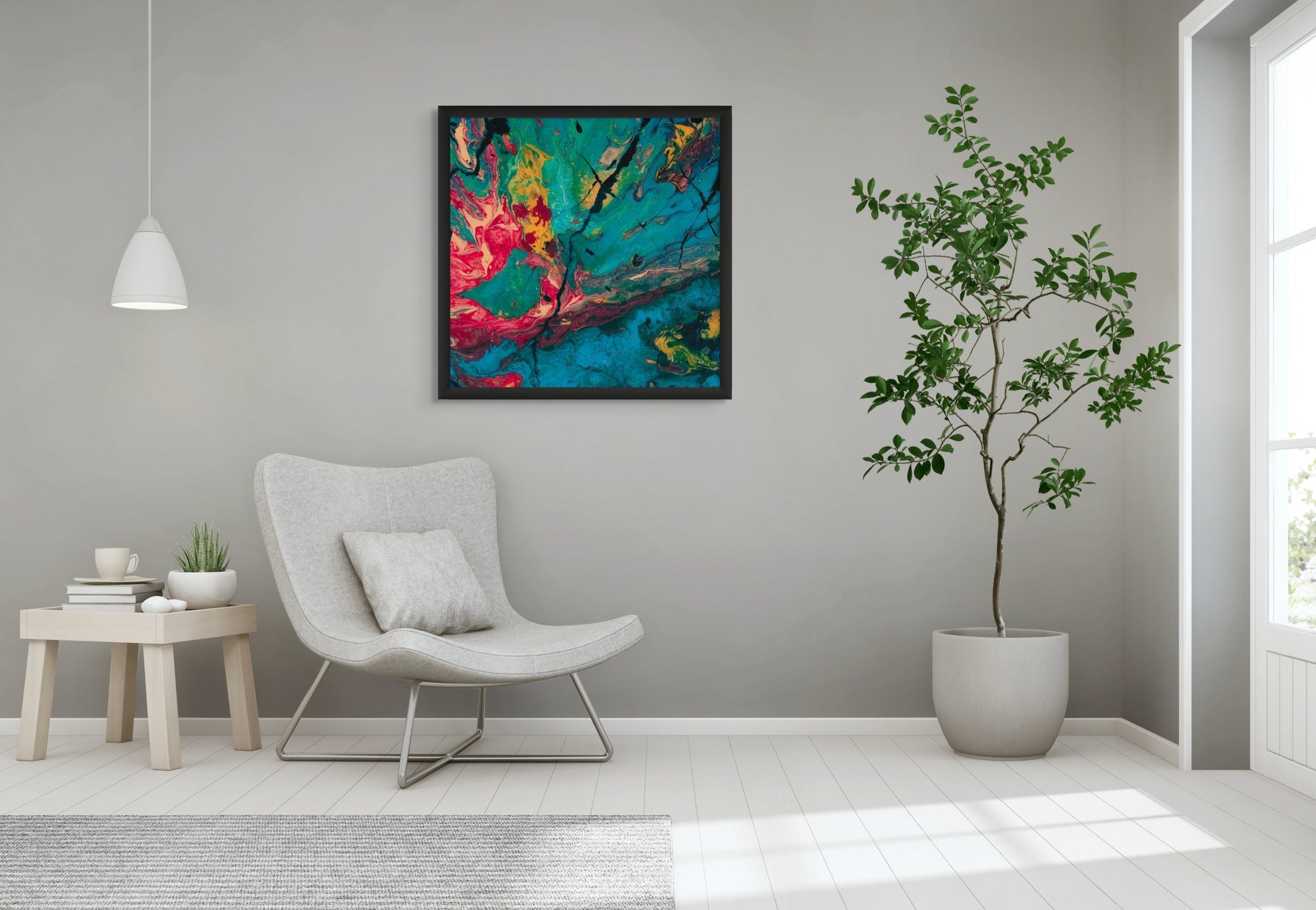 Ebru Sayer Art&Design imzalı bu özel sanat eseri, cam baskı tekniğiyle üretilmiş ve siyah çerçevesiyle tamamlanarak çağdaş bir görünüm kazanmıştır. Turkuaz, sarı, kırmızı ve siyah tonlarının uyumlu geçişleriyle dikkat çeken bu soyut tablo, hem ev hem de ofis dekorasyonları için etkileyici bir atmosfer yaratır.